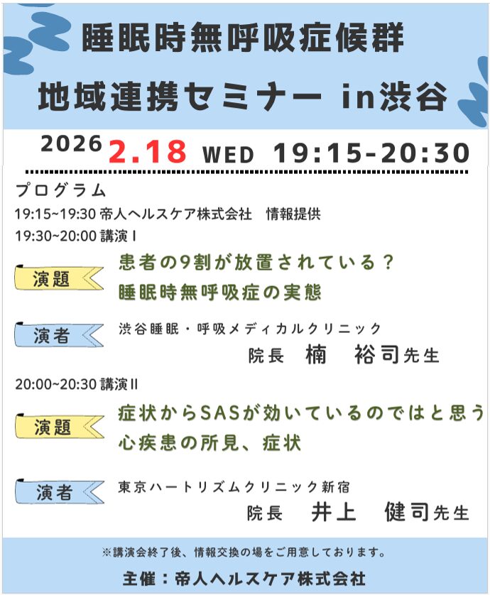 2026.01.21 メディア 世田谷本院 【世田谷本院】毎日新聞朝刊「きょうのセカンドオピニオン」に槇田先生のコメントが掲載されました 2026.01.21 お知らせ 新潟院(2026年4月開院) 【新潟院】医師就任のお知らせ 2026.01.15 お知らせ 新宿院 【新宿院】井上院長 睡眠時無呼吸症候群 地域連携セミナー登壇のお知らせ 2026.01.14 お知らせ 新宿院 【新宿院】井上院長 代々木循環器セミナー登壇のお知らせ 2026.01.13 お知らせ メディア 世田谷本院 【世田谷院】桑原院長のコラムが掲載されました 2026.01.06 お知らせ 新宿院 【新宿院】院長ブログを更新しました 2025.12.23 お知らせ 羽田院 【羽田院】院長ブログを更新しました 2025.12.15 お知らせ 新宿院 【新宿院】院長ブログを更新しました 2025.12.03 お知らせ 羽田院 【羽田院】院長ブログを更新しました 2025.12.02 お知らせ メディア 世田谷本院 【世田谷院】桑原院長のコラムが掲載されました 123...23