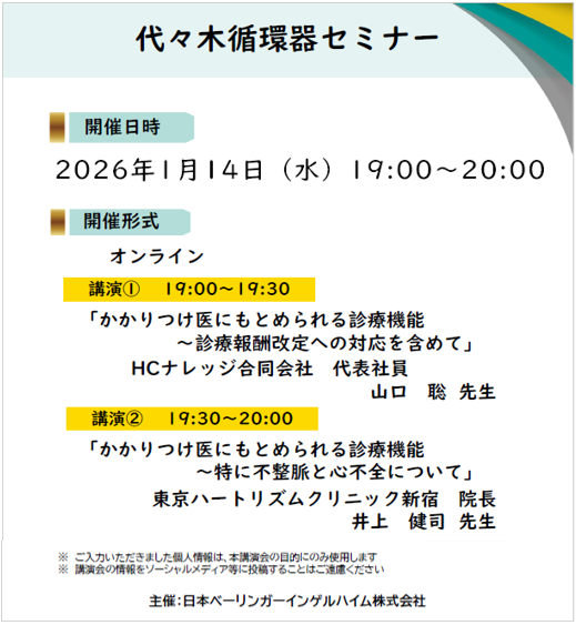 本日 1月14日(水)19:00より 開催される「代々木循環器セミナー(第1回)」 に、新宿院院長・ 井上先生が登壇いたします。※本セミナーは医師向けのセミナーとなります。一般患者様は参加ができませんので予めご了承ください。 CHECK!! この記事を閲覧した人はこの記事も参考にしています。 2025.06.02 お知らせ 新宿院 2025.06.02 お知らせ 新宿院 【YouTube】東京ハートリズムクリニック新宿 院長・井上医師よりご挨拶 2025.06.02 お知らせ 新宿院 2025.06.02 お知らせ 新宿院 【新規開院のお知らせ】東京ハートリズムクリニック新宿 2025.10.17 お知らせ 新宿院 2025.10.17 お知らせ 新宿院 新宿院休診のお知らせ(11月14日、15日) 2026.01.06 お知らせ 新宿院 2026.01.06 お知らせ 新宿院 【新宿院】院長ブログを更新しました