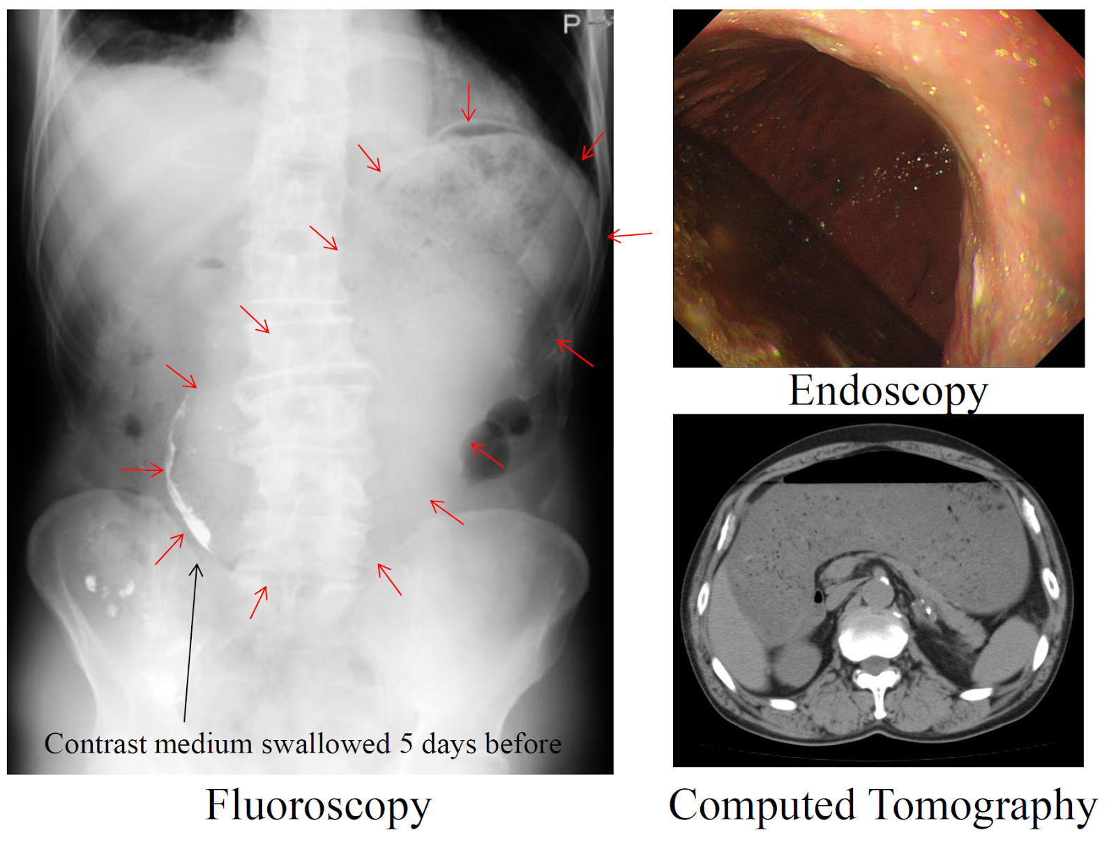 食道迷走神経障害によって、蠕動不全を起こした胃です。食物が貯留して、消化しきれていない状態です。