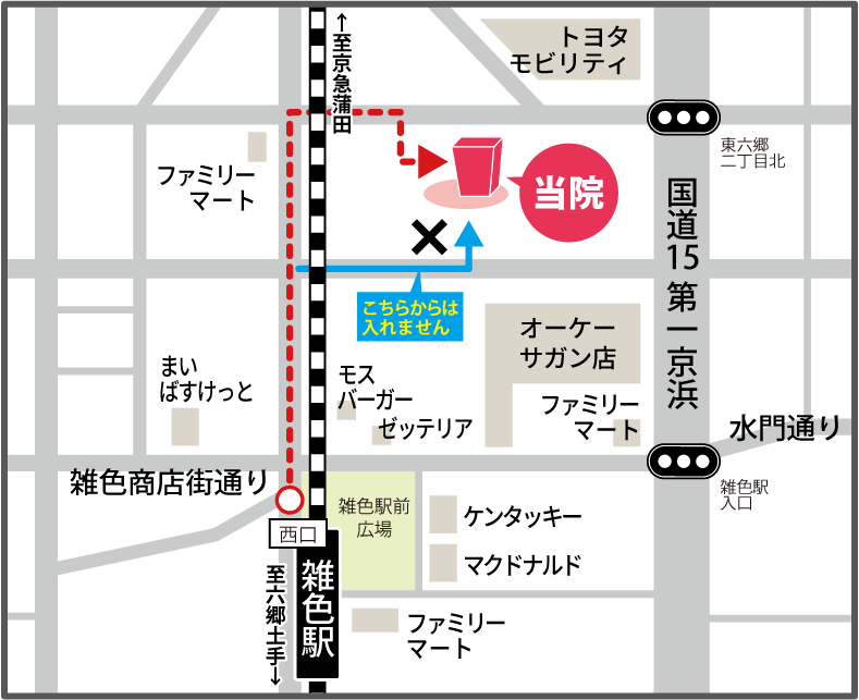 ※東急線利用の場合は「蒲田」経由も可(蒲田→徒歩で京急蒲田乗換→雑色駅)