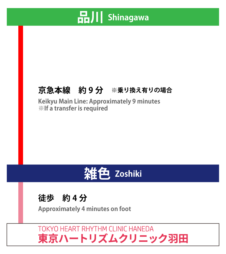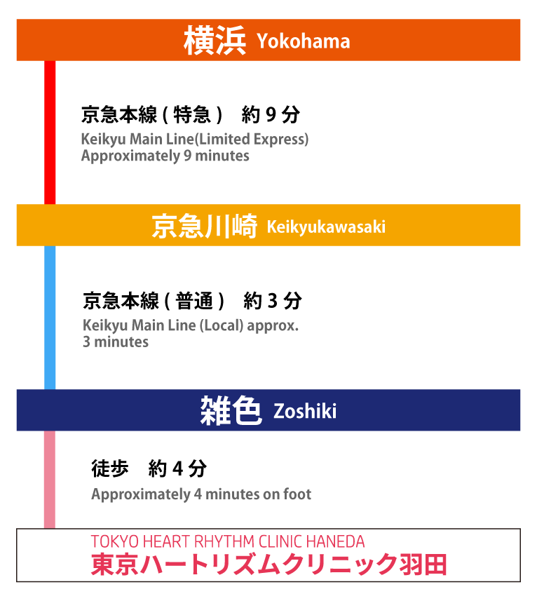 羽田院は京急本線「雑色駅」徒歩4分、川崎から電車で約3分、横浜から約15分と通いやすい立地です。不整脈専門クリニックとして、検査・診断から治療まで一貫して対応し、カテーテルアブレーションやペースメーカー治療にも対応しています。気になる症状があれば、お気軽にご相談ください。